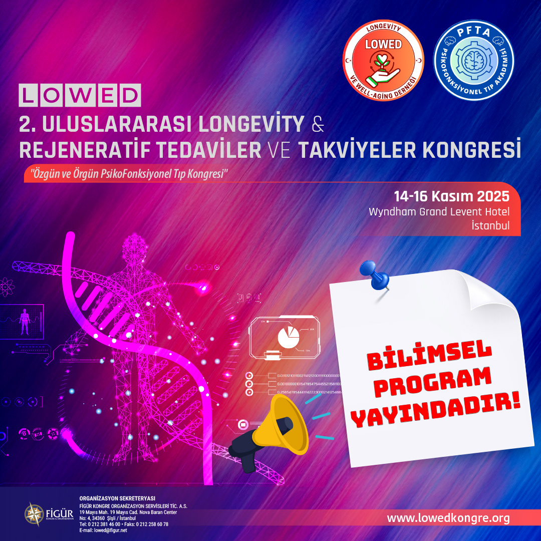 14-16 Kasım 2025 tarihlerinde, İstanbul’un büyüleyici atmosferinde, Wyndham Grand Levent Hotel ’de düzenleyeceğimiz LOWED 2. Uluslararası Longevity Rejeneratif Tedaviler ve Takviyeler Kongresi ’ne sizleri davet etmekten gurur ve coşku duyuyoruz. Bu yılki kongremizin teması “Klinik Tecrübe ve Literatür Destekli Vaka Analizleri ve PsikoFonksiyonel Tıp Hap Bilgileri” ve sloganı “Uzun, Sağlıklı ve Mutlu Bir Geleceğe Birlikte Adım Atalım ve Sınırları Zorlayalım!” olarak belirlenmiştir. Bu tema ve slogan çerçevesinde, multidisipliner bir yaklaşımla, bilimin rehberliğinde yeni ufuklara yolculuk edeceğiz.